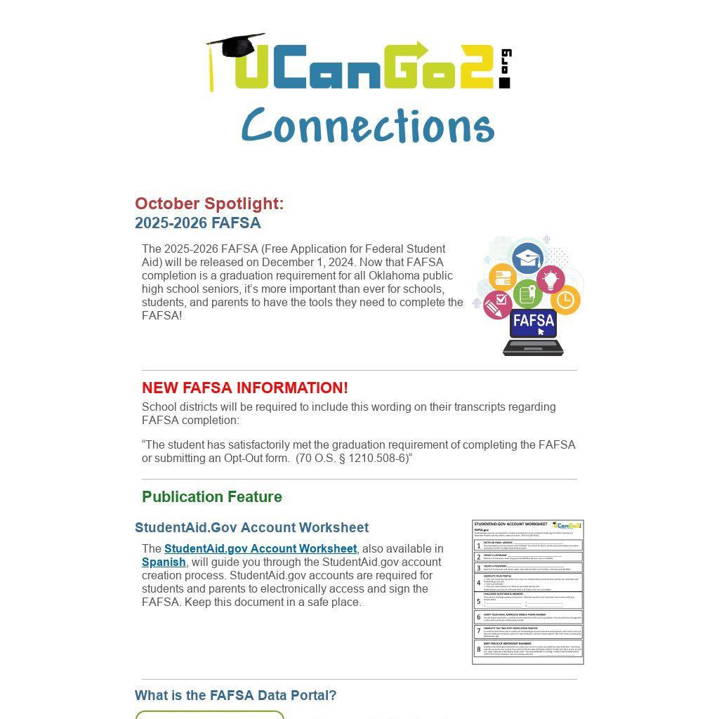 The 2025-2026 FAFSA (Free Application for Federal Student Aid) will be released on December 1, 2024. Now that FAFSA completion is a graduation requirement for all Oklahoma public high school seniors, it’s more important than ever for schools, students, and parents to have the tools they need to complete the FAFSA!