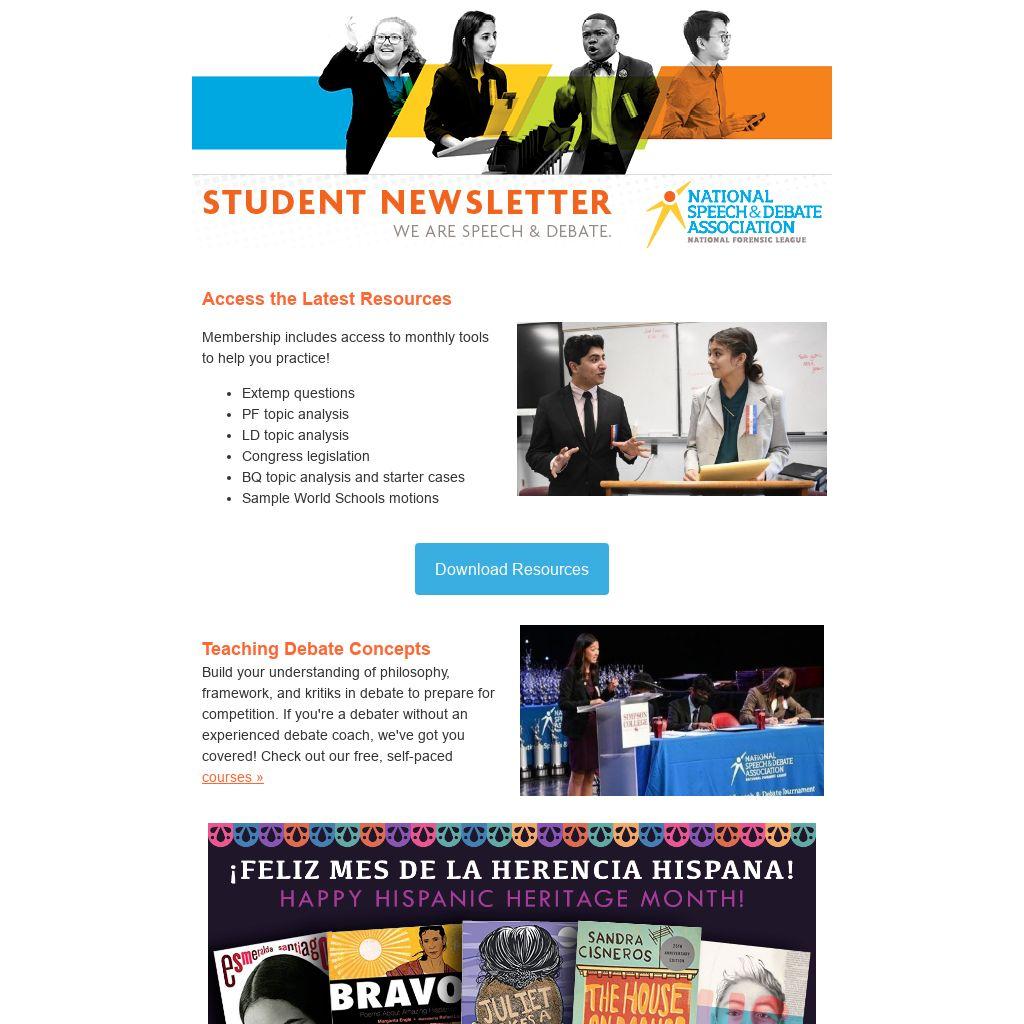 ¡Feliz Mes de la Herencia Hispana! Join us in honoring all of the Hispanic and Latine students, coaches, alumni, and supporters who help make speech and debate possible. Browse our Hispanic Heritage Month resources for posters, literature, and more »