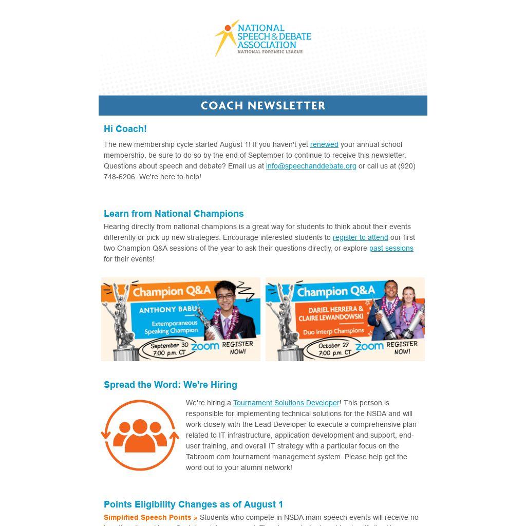 The new membership cycle started August 1! If you haven't yet renewed your annual school membership, be sure to do so by the end of September to continue to receive this newsletter. Questions about speech and debate? Email us at info@speechanddebate.org or call us at (920) 748-6206. We're here to help!