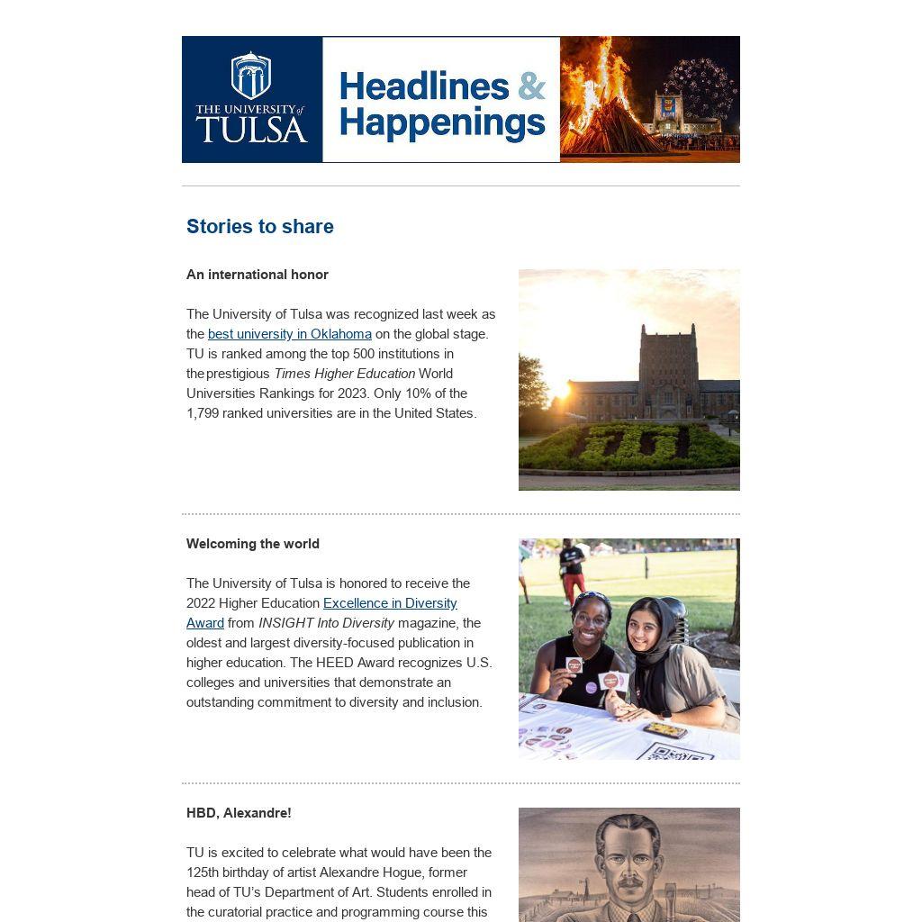Begin Homecoming Week with a TU Symphony Orchestra performance. The concert features Coronation from the ballet suite The Exiles Return in honor of retiring TU Professor Joseph Rivers; Overture to The Marriage of Figaro by Mozart; and music by J.S. Bach and Gustav Holst. Details