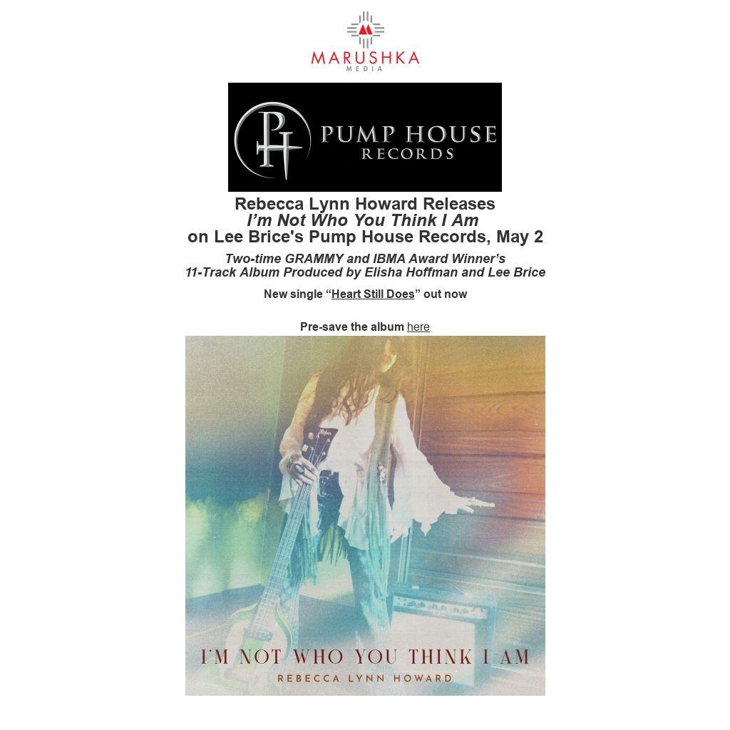 | NASHVILLE, Tenn. (Jan. 24, 2025) — Two-time GRAMMY and IBMA winner Rebecca Lynn Howard — songwriter who has written hits for country royalty and “possesses one of country music’s most powerful voices” (Billboard) — today releases “Heart Still Does,” an upbeat track from her forthcoming album, I’m Not Who You Think I Am, due out May 2 via Lee Brice's imprint, Pump House Records.