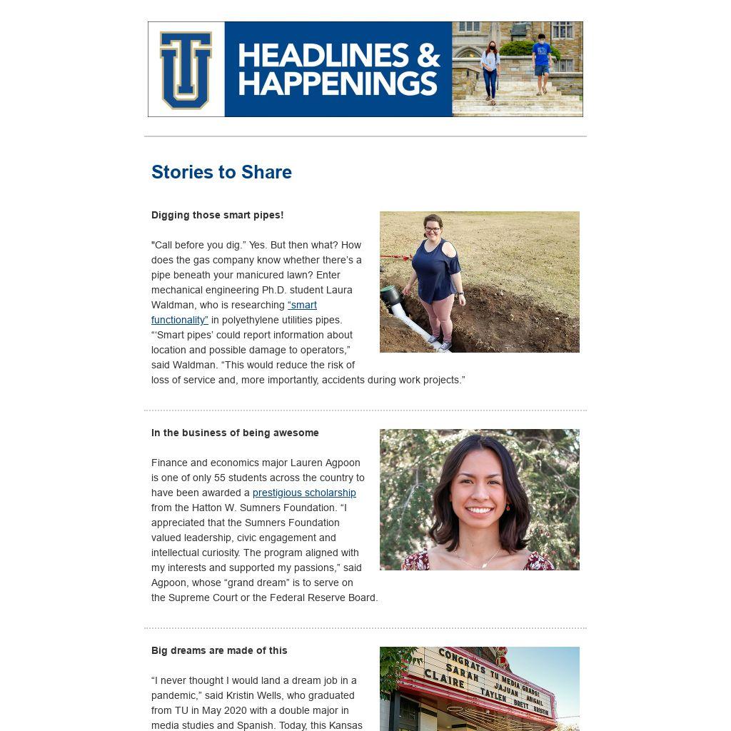 “I never thought I would land a dream job in a pandemic,” said Kristin Wells, who graduated from TU in May 2020 with a double major in media studies and Spanish. Today, this Kansas City, Kansas, native is a digital content producer at Tulsa’s News on 6. Wells credits her media studies training and involvement in TU’s Global Scholars program for developing her broad generalist understanding and fascination with content across the news cycle.