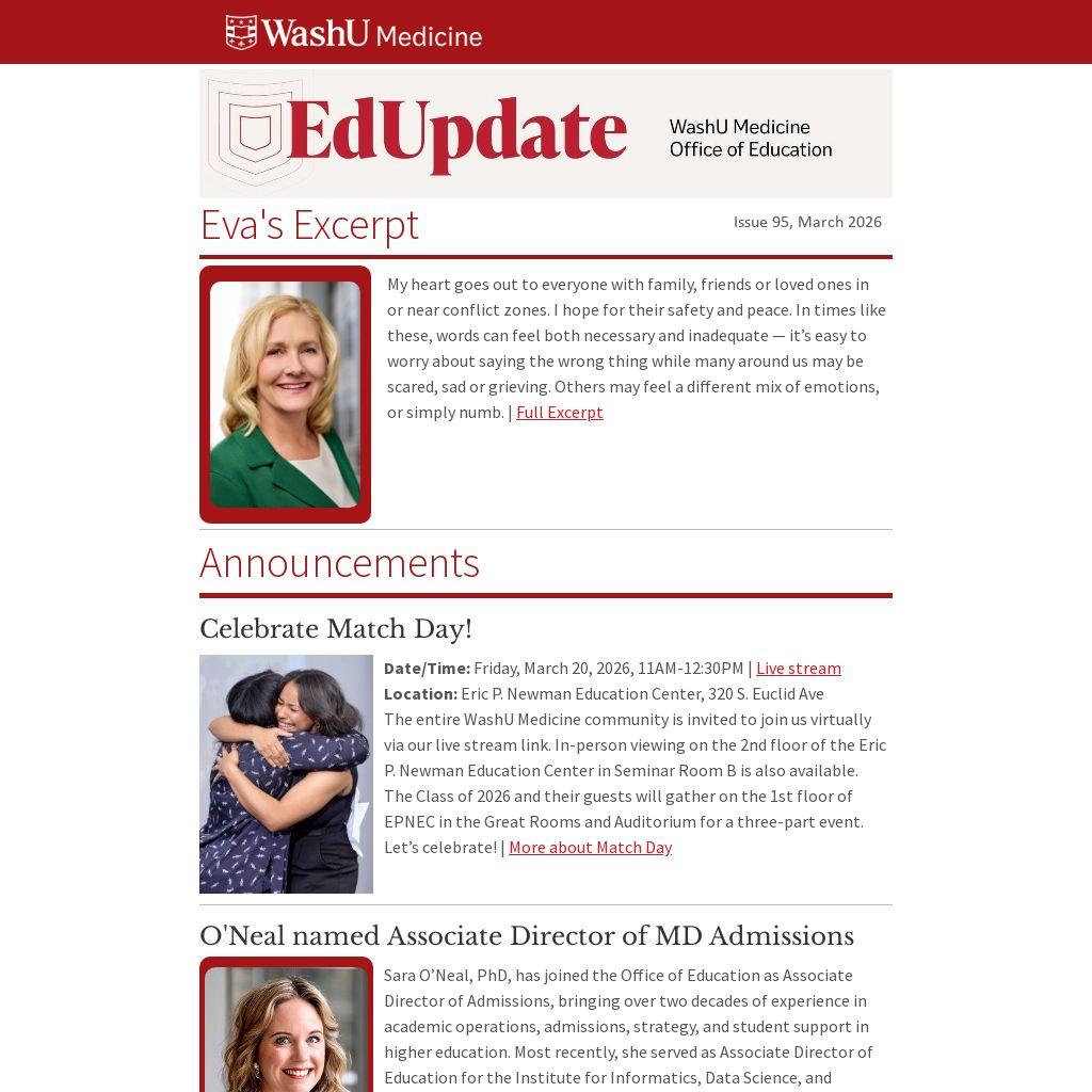 The entire WashU Medicine community is invited to join us virtually via our live stream link. In-person viewing on the 2nd floor of the Eric P. Newman Education Center in Seminar Room B is also available. The Class of 2026 and their guests will gather on the 1st floor of EPNEC in the Great Rooms and Auditorium for a three-part event. Let’s celebrate! | More about Match Day
