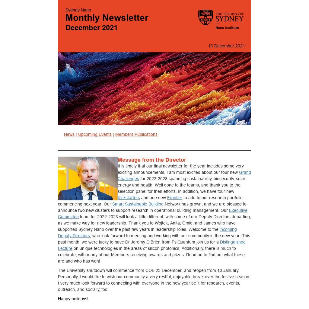 Message from the DirectorIt is timely that our final newsletter for the year includes some very exciting announcements. I am most excited about our four new Grand Challenges for 2022-2023 spanning sustainability, biosecurity, solar energy and health. Well done to the teams, and thank you to the selection panel for their efforts. In addition, we have four new Kickstarters and one new Frontier to add to our research portfolio commencing next year. Our Smart Sustainable Building Network has grown, and we are pleased to announce two new clusters to support research in operational building management. Our Executive Committee team for 2022-2023 will look a little different, with some of our Deputy Directors departing, as we make way for new leadership. Thank you to Wojtek, Anita, Omid, and James who have supported Sydney Nano over the past few years in leadership roles. Welcome to the incoming Deputy Directors, who look forward to meeting and working with our community in the new year. This past month, we were lucky to have Dr Jeremy O'Brien from PsiQuantum join us for a Distinguished Lecture on unique technologies in the areas of silicon photonics. Additionally, there is much to celebrate, with many of our Members receiving awards and prizes. Read on to find out what these are and who has won!