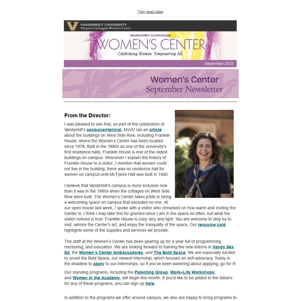 From the Director:I was pleased to see that, as part of the celebration of Vanderbilt’s sesquicentennial, MyVU ran an article about the buildings on West Side Row, including Franklin House, where the Women’s Center has been located since 1978. Built in the 1880s as one of the university’s first residence halls, Franklin House is one of the oldest buildings on campus. Whenever I explain the history of Franklin House to a visitor, I mention that women could not live in the building; there was no residence hall for women on campus until McTyeire Hall was built in 1940.