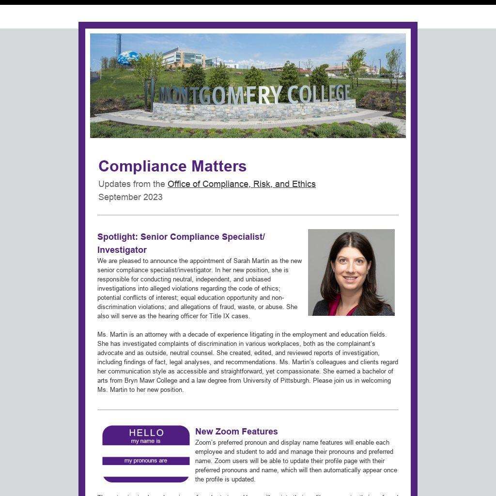 Spotlight: Senior Compliance Specialist/ InvestigatorWe are pleased to announce the appointment of Sarah Martin as the new senior compliance specialist/investigator. In her new position, she is responsible for conducting neutral, independent, and unbiased investigations into alleged violations regarding the code of ethics; potential conflicts of interest; equal education opportunity and non-discrimination violations; and allegations of fraud, waste, or abuse. She also will serve as the hearing officer for Title IX cases.