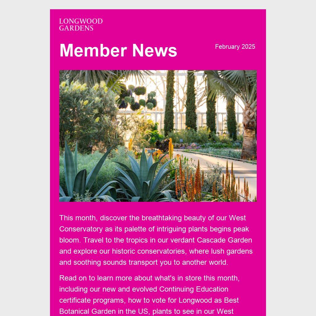 Read on to learn more about what's in store this month, including our new and evolved Continuing Education certificate programs, how to vote for Longwood as Best Botanical Garden in the US, plants to see in our West Conservatory, and more!