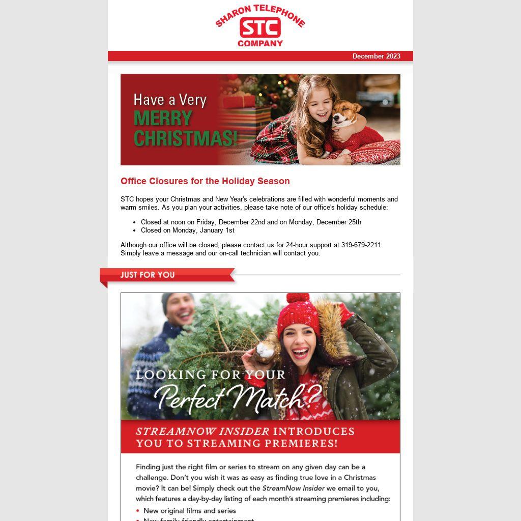 Office Closures for the Holiday Season STC hopes your Christmas and New Year's celebrations are filled with wonderful moments and warm smiles. As you plan your activities, please take note of our office's holiday schedule: