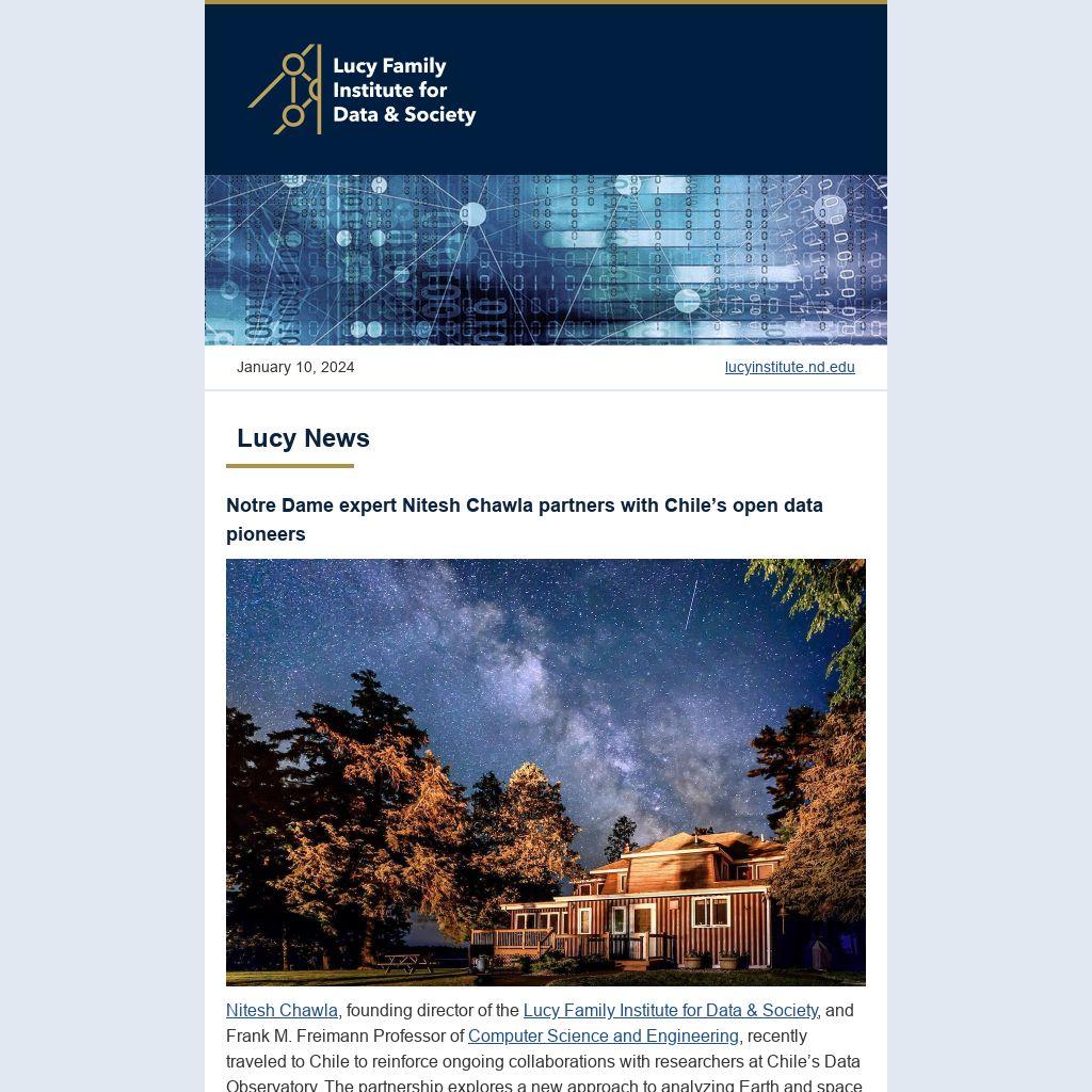 Nitesh Chawla, founding director of the Lucy Family Institute for Data & Society, and Frank M. Freimann Professor of Computer Science and Engineering, recently traveled to Chile to reinforce ongoing collaborations with researchers at Chile’s Data Observatory. The partnership explores a new approach to analyzing Earth and space—one that puts observation data directly into the hands of people who can use it to promote sustainability, prevent natural disasters, and prepare for the effects of climate change.