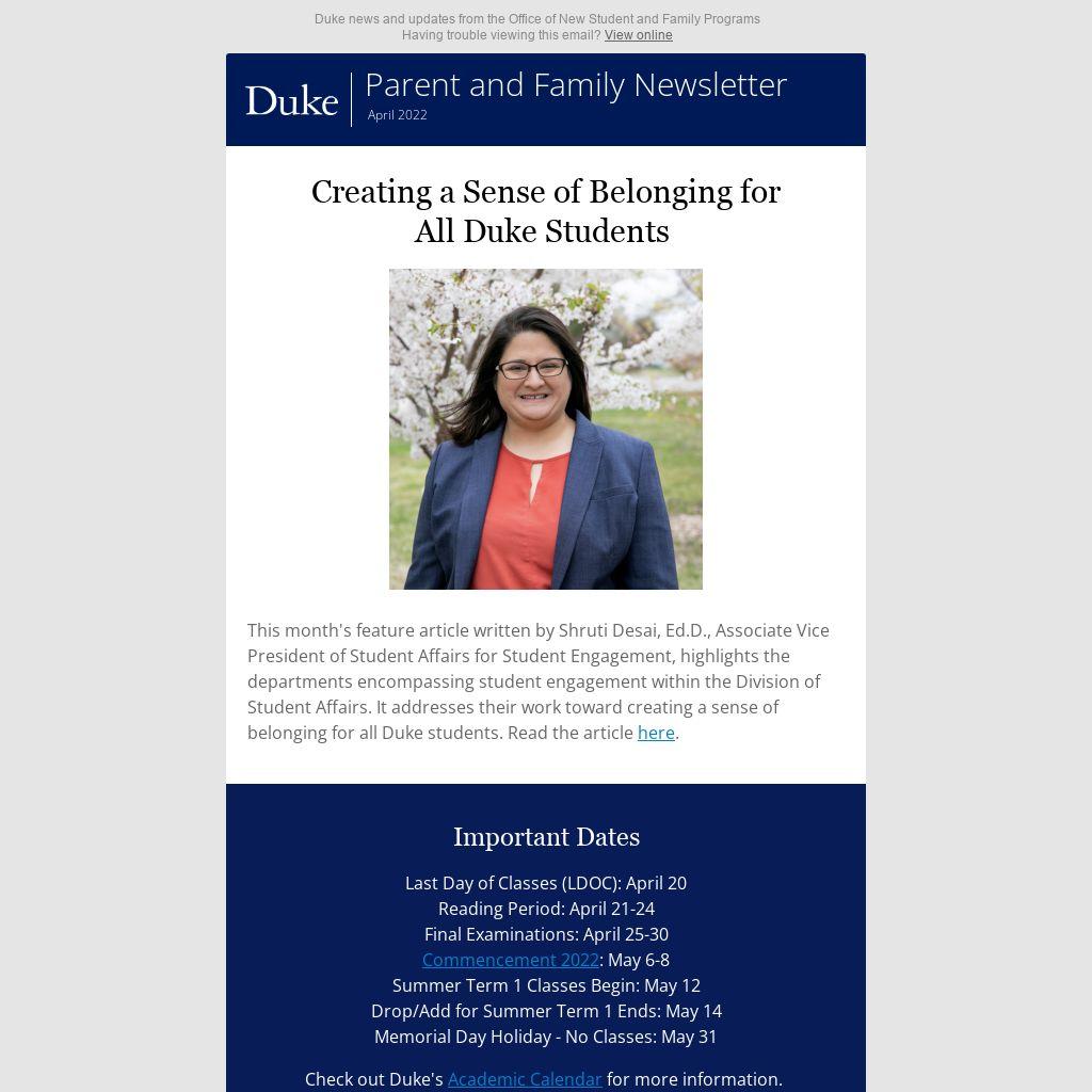 This month's feature article written by Shruti Desai, Ed.D., Associate Vice President of Student Affairs for Student Engagement, highlights the departments encompassing student engagement within the Division of Student Affairs. It addresses their work toward creating a sense of belonging for all Duke students. Read the article here.