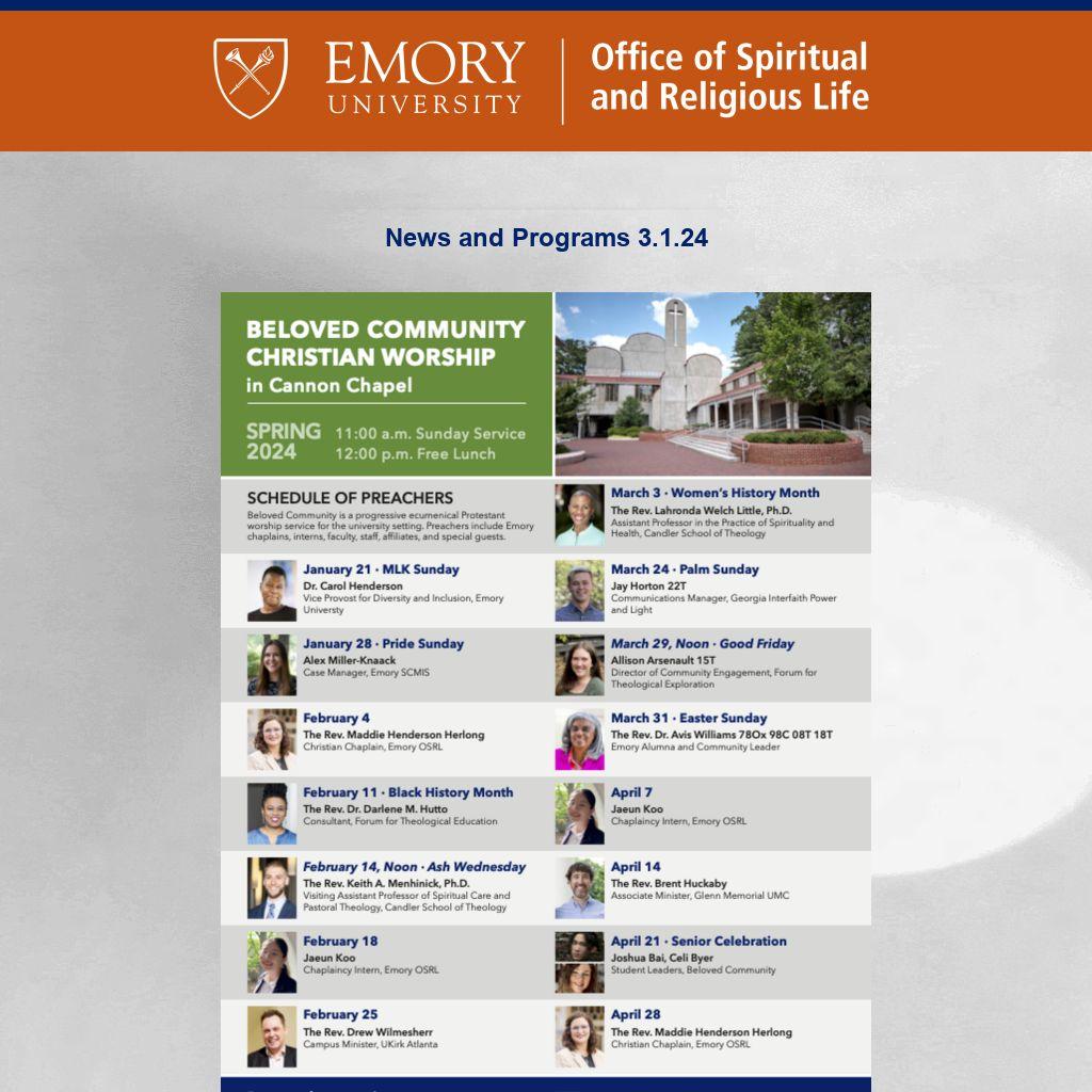 Emory OSRL ENews is published weekly during term by the Emory University Office of Spiritual and Religious Life publicizing Atlanta-campus spiritual life programs. It is not a comprehensive listing. For Oxford College spiritual life, please click here. To submit information or to update your preferences, please contact religiouslife@emory.edu.