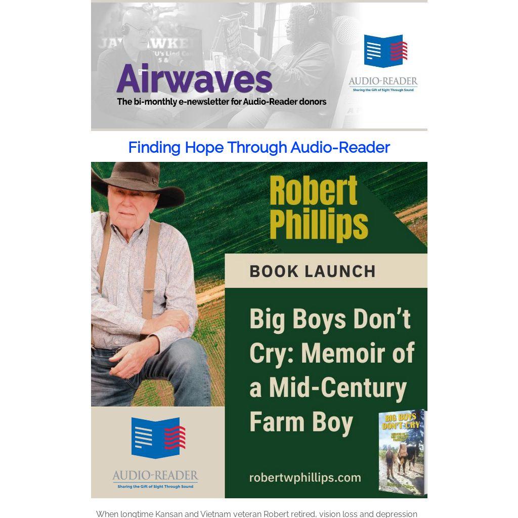 When longtime Kansan and Vietnam veteran Robert retired, vision loss and depression made daily life difficult, until he discovered Audio-Reader. Through the stories he heard, he found comfort, connection, and a renewed sense of purpose. Now, at 80 years old, Robert has even written his own book about growing up in rural Kansas and partnered with Audio-Reader to help launch it.