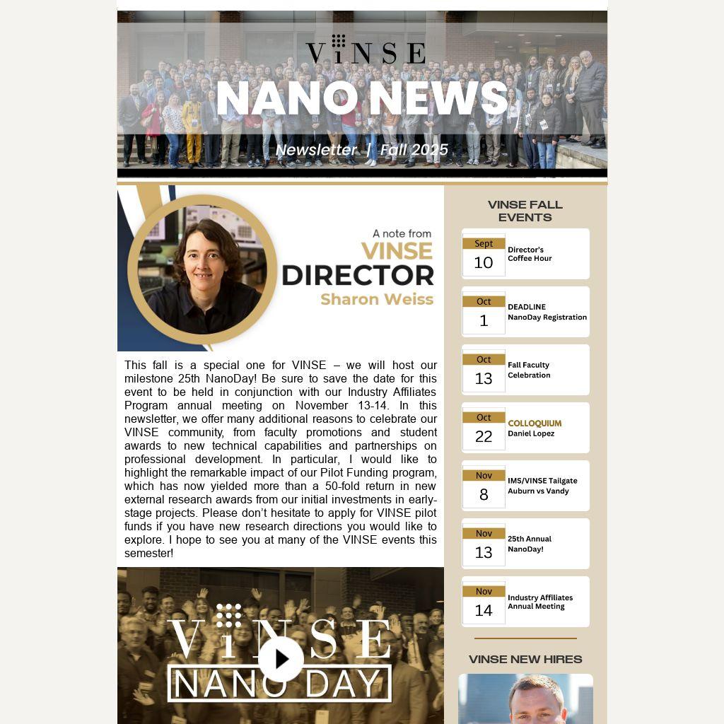This fall is a special one for VINSE – we will host our milestone 25th NanoDay! Be sure to save the date for this event to be held in conjunction with our Industry Affiliates Program annual meeting on November 13-14. In this newsletter, we offer many additional reasons to celebrate our VINSE community, from faculty promotions and student awards to new technical capabilities and partnerships on professional development. In particular, I would like to highlight the remarkable impact of our Pilot Funding program, which has now yielded more than a 50-fold return in new external research awards from our initial investments in early-stage projects. Please don’t hesitate to apply for VINSE pilot funds if you have new research directions you would like to explore. I hope to see you at many of the VINSE events this semester!