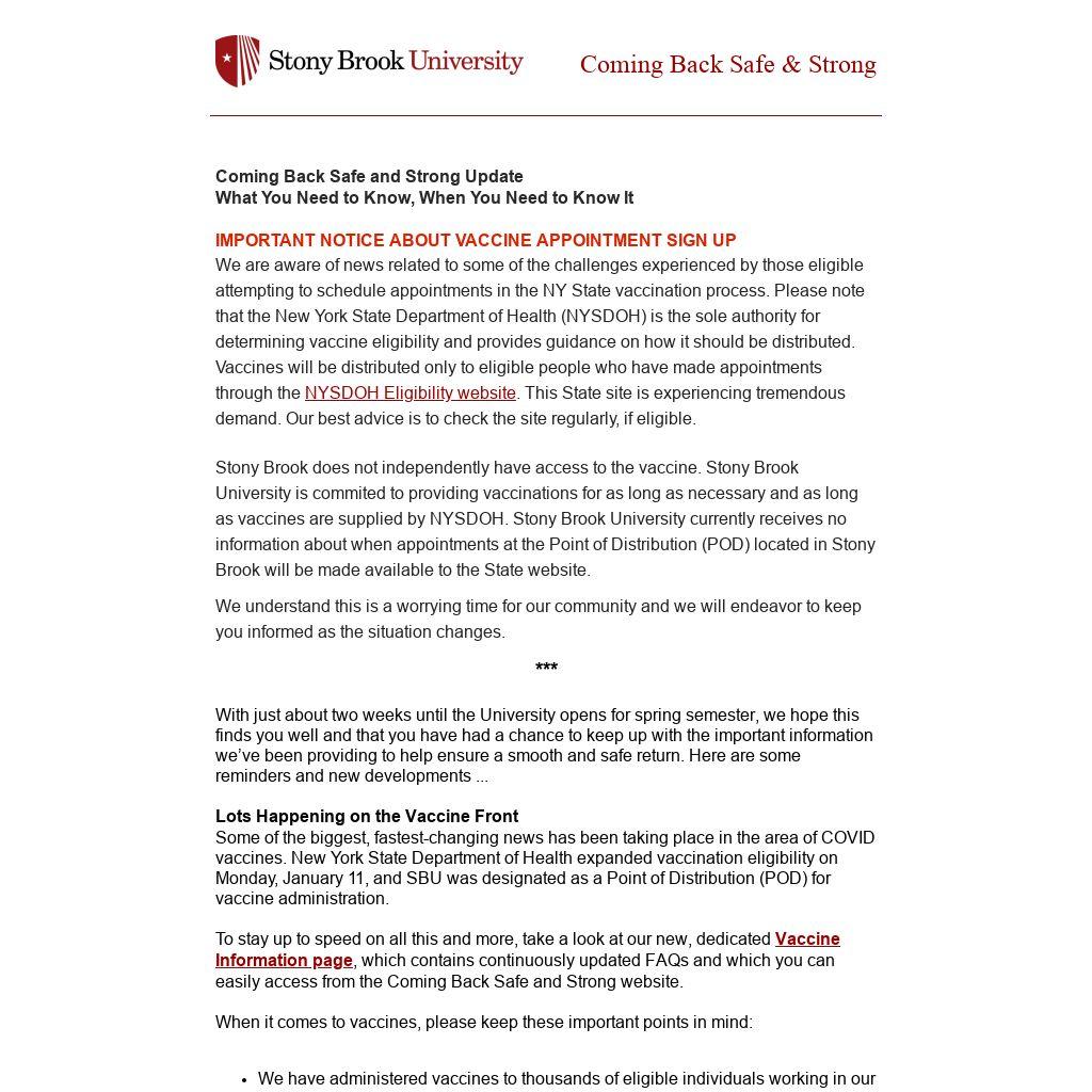Some of the biggest, fastest-changing news has been taking place in the area of COVID vaccines. New York State Department of Health expanded vaccination eligibility on Monday, January 11, and SBU was designated as a Point of Distribution (POD) for vaccine administration.
