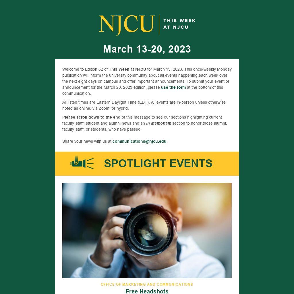 Welcome to Edition 62 of This Week at NJCU for March 13, 2023. This once-weekly Monday publication will inform the university community about all events happening each week over the next eight days on campus and offer important announcements. To submit your event or announcement for the March 20, 2023 edition, please use the form at the bottom of this communication.