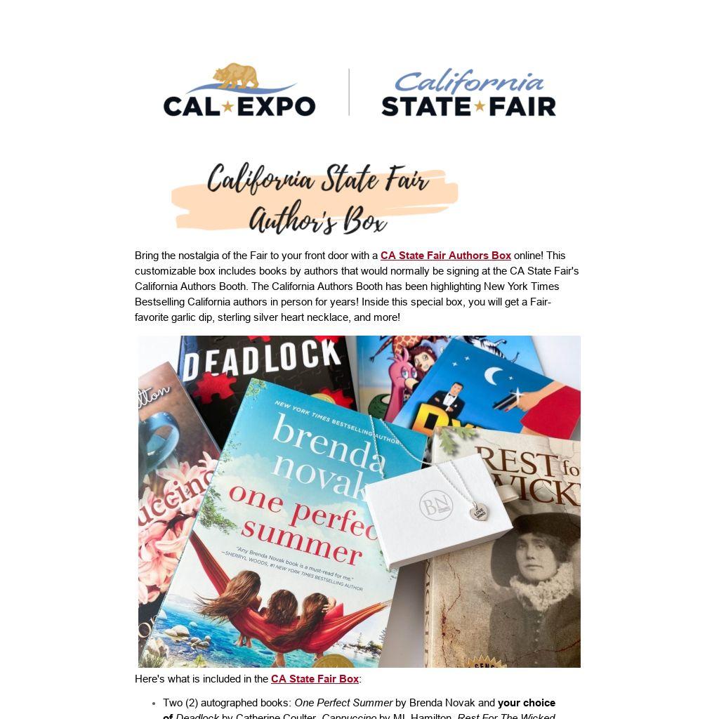 Bring the nostalgia of the Fair to your front door with a CA State Fair Authors Box online! This customizable box includes books by authors that would normally be signing at the CA State Fair's California Authors Booth. The California Authors Booth has been highlighting New York Times Bestselling California authors in person for years! Inside this special box, you will get a Fair-favorite garlic dip, sterling silver heart necklace, and more!