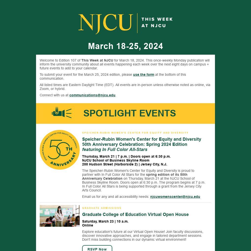 Welcome to Edition 107 of This Week at NJCU for March 18, 2024. This once-weekly Monday publication will inform the university community about all events happening each week over the next eight days on campus + future events to add to your calendar.