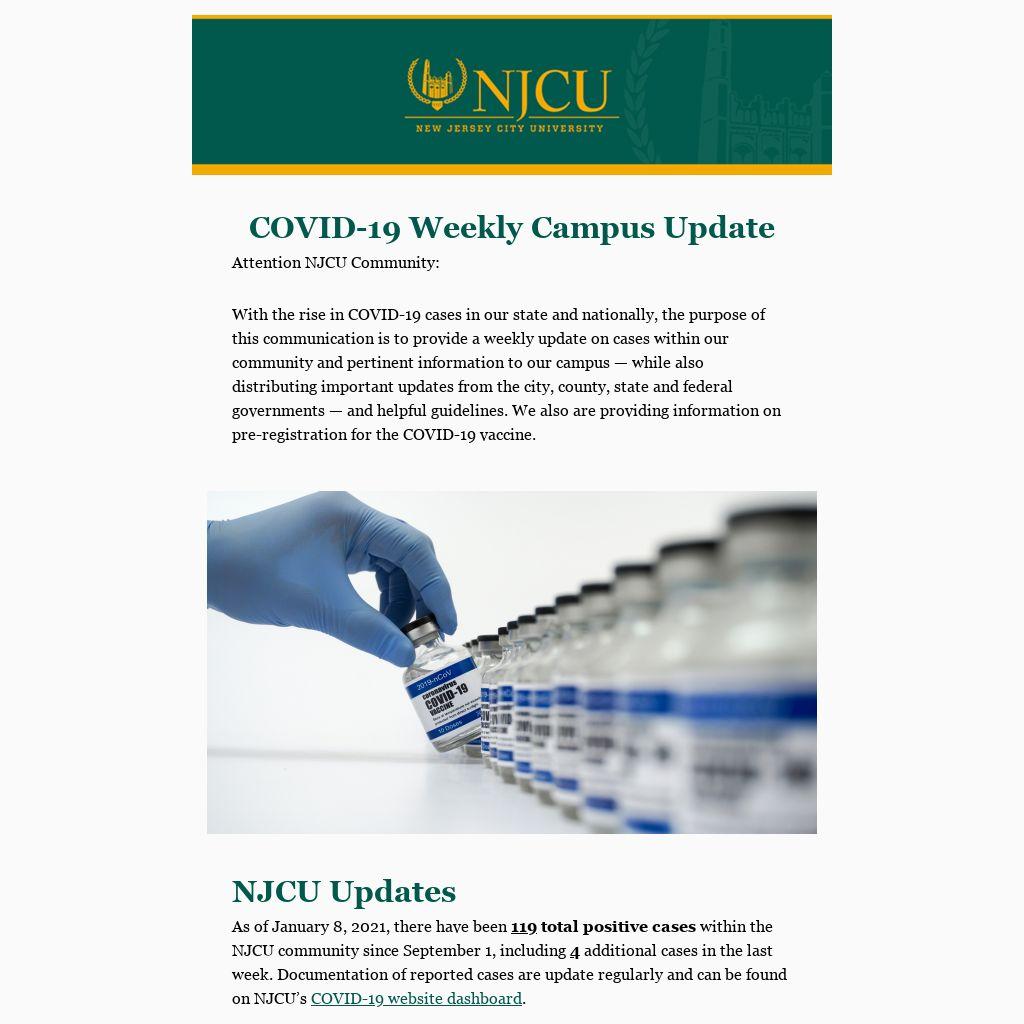 NJCU is continuing to plan for increased opportunities for in-person, on-campus learning this spring. These plans are continually in evaluation and will be updated accordingly.