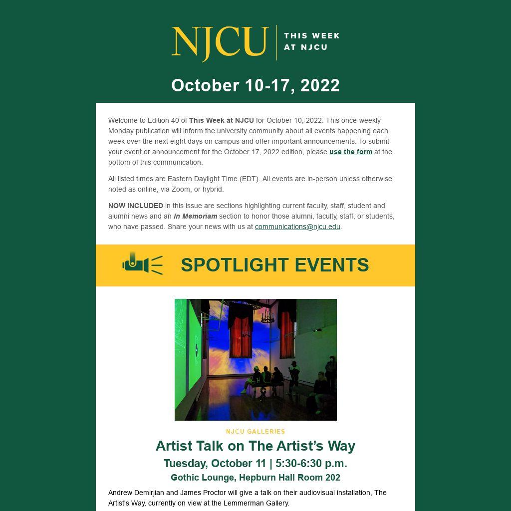 Welcome to Edition 40 of This Week at NJCU for October 10, 2022. This once-weekly Monday publication will inform the university community about all events happening each week over the next eight days on campus and offer important announcements. To submit your event or announcement for the October 17, 2022 edition, please use the form at the bottom of this communication.