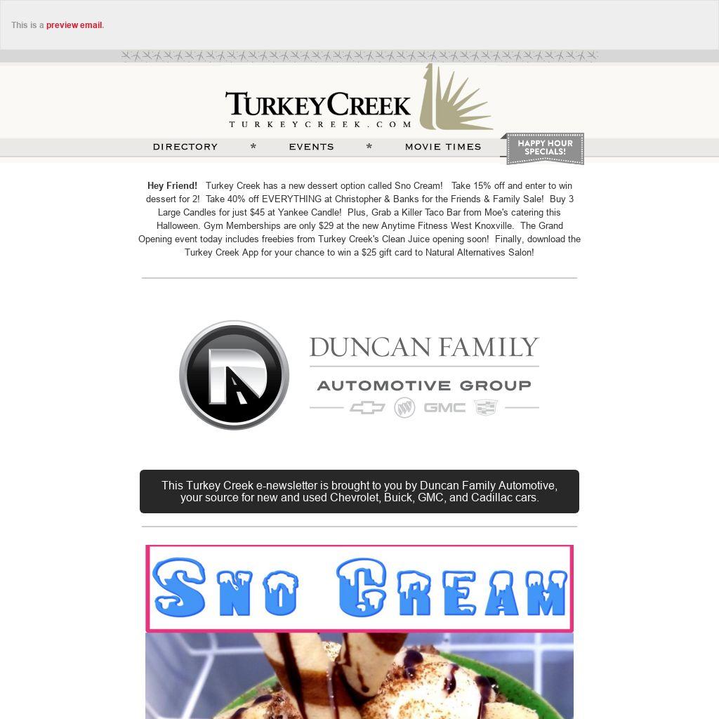Hey Friend! Turkey Creek has a new dessert option called Sno Cream! Take 15% off and enter to win dessert for 2! Take 40% off EVERYTHING at Christopher & Banks for the Friends & Family Sale! Buy 3 Large Candles for just $45 at Yankee Candle! Plus, Grab a Killer Taco Bar from Moe's catering this Halloween. Gym Memberships are only $29 at the new Anytime Fitness West Knoxville. The Grand Opening event today includes freebies from Turkey Creek's Clean Juice opening soon! Finally, download the Turkey Creek App for your chance to win a $25 gift card to Natural Alternatives Salon!