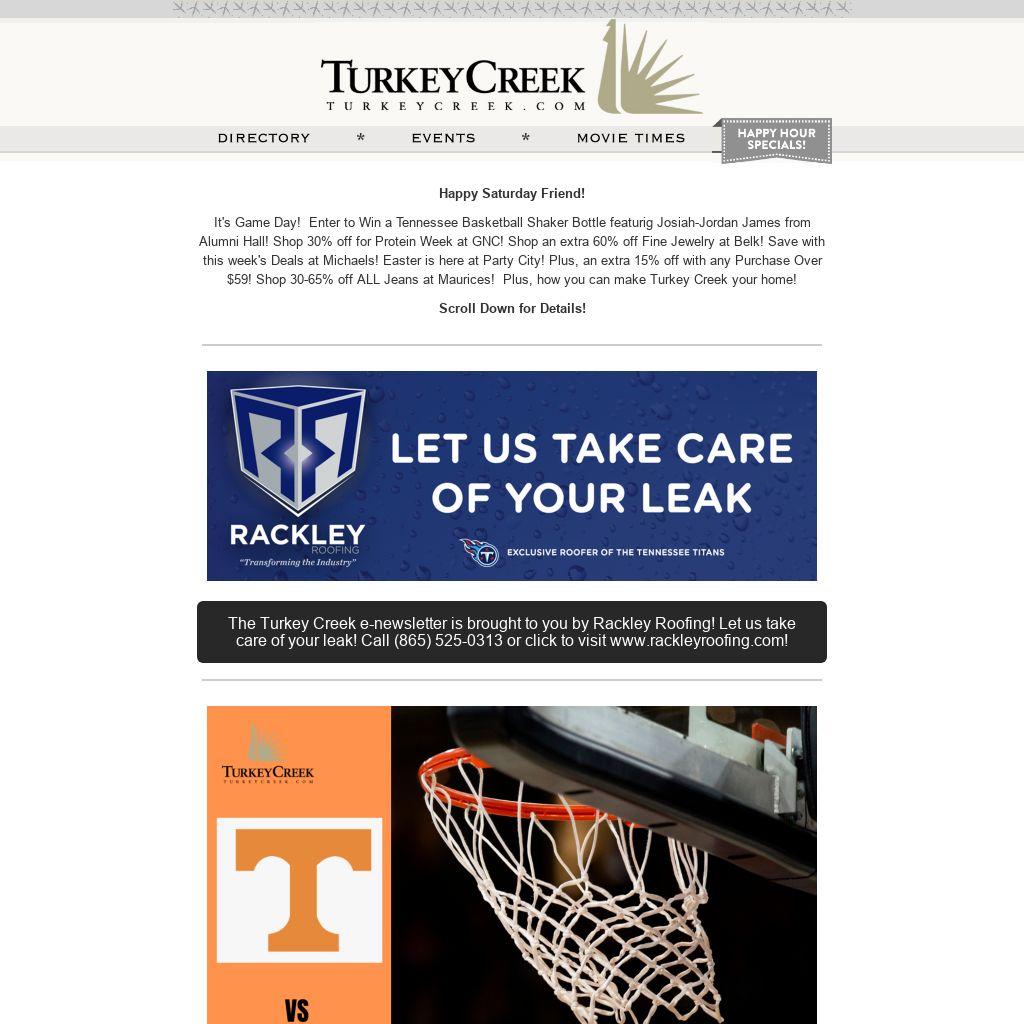 It's Game Day! Enter to Win a Tennessee Basketball Shaker Bottle featurig Josiah-Jordan James from Alumni Hall! Shop 30% off for Protein Week at GNC! Shop an extra 60% off Fine Jewelry at Belk! Save with this week's Deals at Michaels! Easter is here at Party City! Plus, an extra 15% off with any Purchase Over $59! Shop 30-65% off ALL Jeans at Maurices! Plus, how you can make Turkey Creek your home!