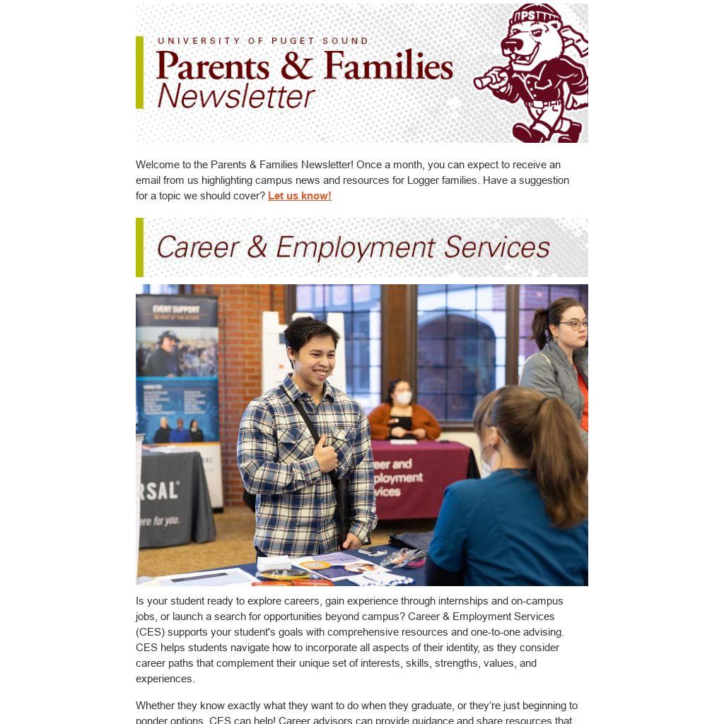 Whether they know exactly what they want to do when they graduate, or they’re just beginning to ponder options, CES can help! Career advisors can provide guidance and share resources that will point them in the right direction. Encourage your student to visit ces.pugetsound.edu to schedule an appointment, access career resources, browse a list of on-campus jobs, connect with alumni mentors, and more!