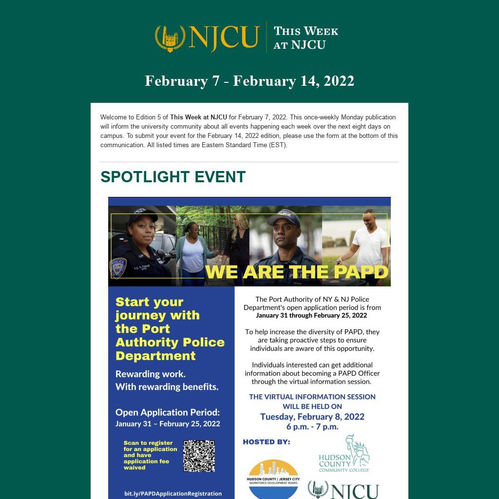 Welcome to Edition 5 of This Week at NJCU for February 7, 2022. This once-weekly Monday publication will inform the university community about all events happening each week over the next eight days on campus. To submit your event for the February 14, 2022 edition, please use the form at the bottom of this communication. All listed times are Eastern Standard Time (EST).