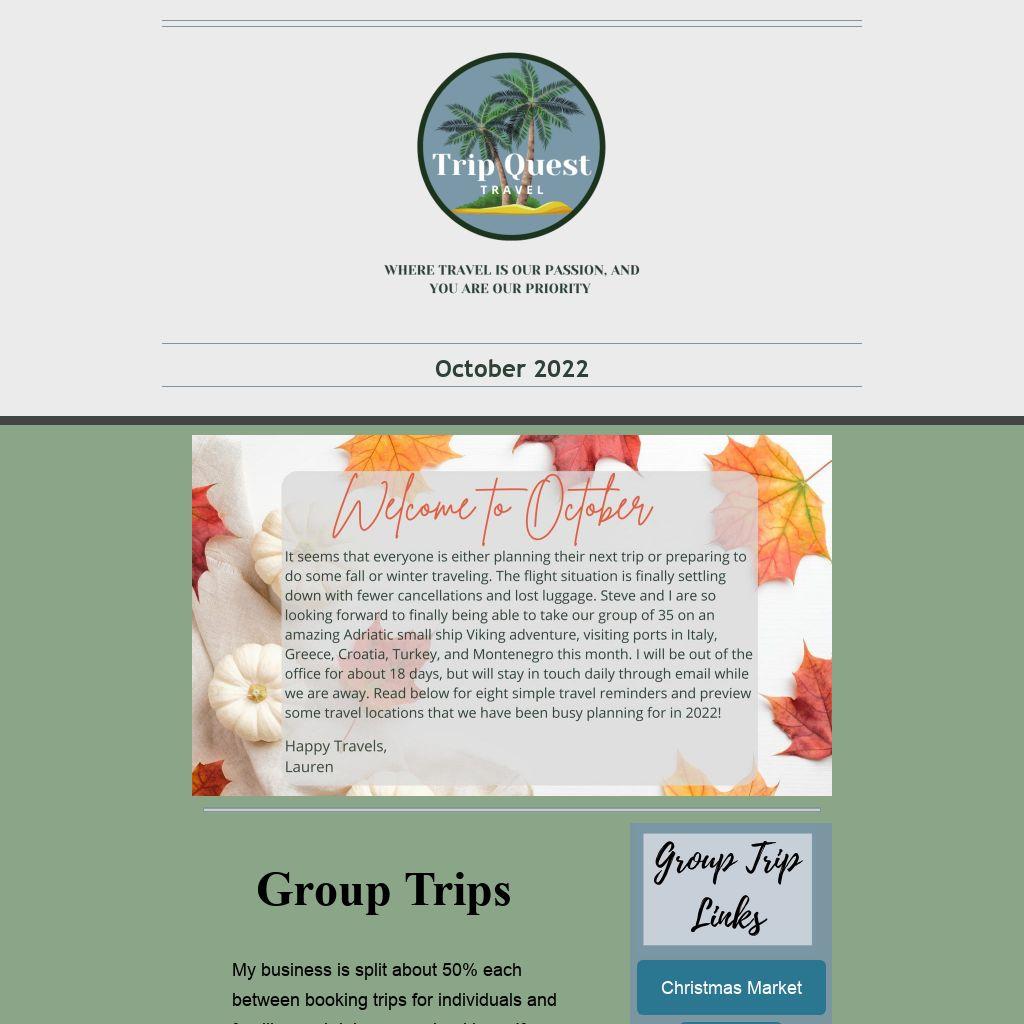 I am Lauren Williams, owner of Trip Quest Travel Services for the past seven years. Moving from three decades in education to becoming a travel consultant has caused me to shift from “The Doctor of Education” to “The Doctor of Travel.” My clients are often just like me – they want a rejuvenating vacation that teaches them about the world and the cultures around them. I love beautiful scenery, exploring new places, and learning something new every day! Aside from travel, I stay busy with my husband, Steve, and our four children and thirteen grandchildren. Being active in the church and in our community feeds our souls as well. I love to play pickleball and bridge when I am not helping clients plan that perfect trip! Because our world is so much smaller now, I am happy to work with clients wherever they might live…but by referral only. Let me know if you have friends or family who would like to added to my monthly newsletter list! Also, let me know if there is something you’d like to know more about!