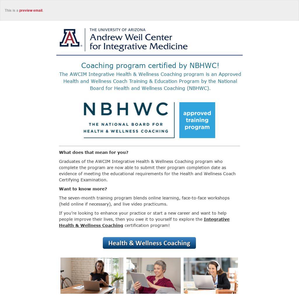 Graduates of the AWCIM Integrative Health & Wellness Coaching program who complete the program are now able to submit their program completion date as evidence of meeting the educational requirements for the Health and Wellness Coach Certifying Examination.