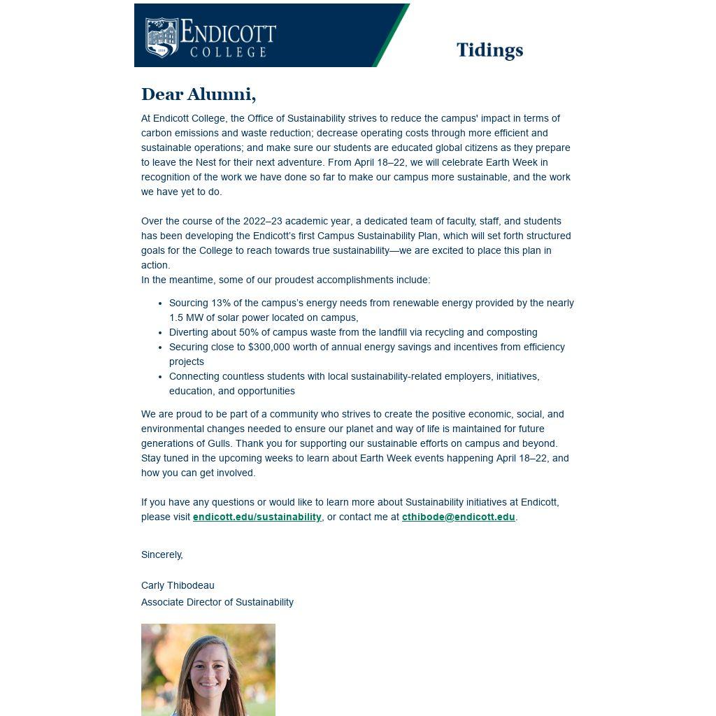 If you have any questions or would like to learn more about Sustainability initiatives at Endicott, please visit endicott.edu/sustainability, or contact me at cthibode@endicott.edu.