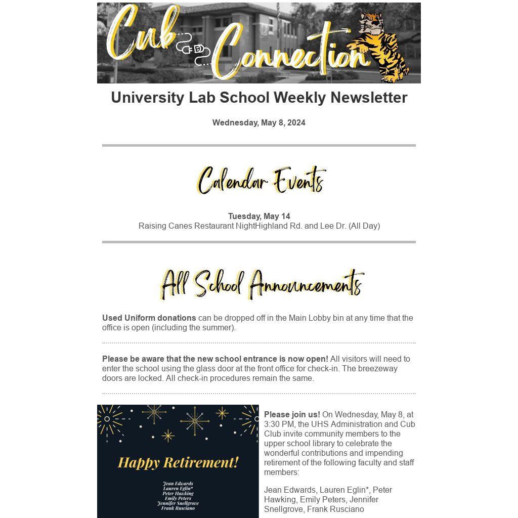 Please join us! On Wednesday, May 8, at 3:30 PM, the UHS Administration and Cub Club invite community members to the upper school library to celebrate the