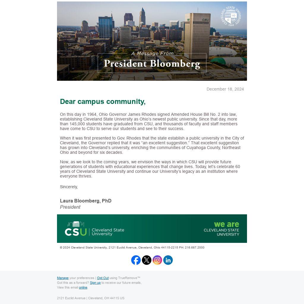 Now, as we look to the coming years, we envision the ways in which CSU will provide future generations of students with educational experiences that change lives. Today, let’s celebrate 60 years of Cleveland State University and continue our University’s legacy as an institution where everyone thrives.