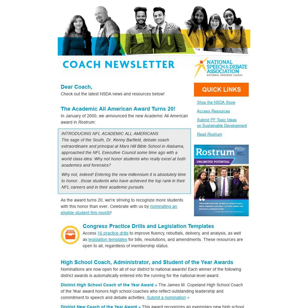 Middle School Coach of the Year Award » The National Speech & Debate Association’s Middle School Coach of the Year award annually honors middle school coaches who reflect outstanding leadership and commitment to speech and debate activities. Submit a nomination »