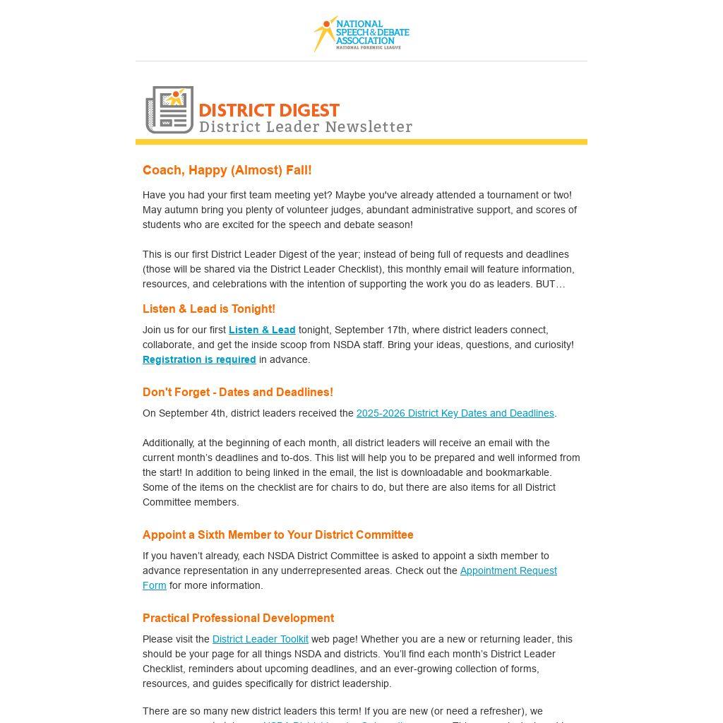 Please visit the District Leader Toolkit web page! Whether you are a new or returning leader, this should be your page for all things NSDA and districts. You’ll find each month’s District Leader Checklist, reminders about upcoming deadlines, and an ever-growing collection of forms, resources, and guides specifically for district leadership.