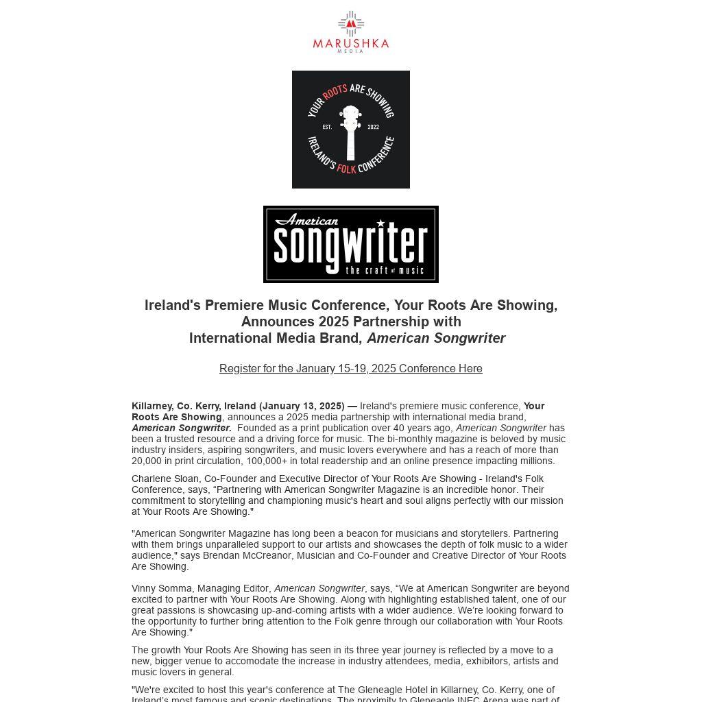 Killarney, Co. Kerry, Ireland (January 13, 2025) — Ireland's premiere music conference, Your Roots Are Showing, announces a 2025 media partnership with international media brand, American Songwriter.  Founded as a print publication over 40 years ago, American Songwriter has been a trusted resource and a driving force for music. The bi-monthly magazine is beloved by music industry insiders, aspiring songwriters, and music lovers everywhere and has a reach of more than 20,000 in print circulation, 100,000+ in total readership and an online presence impacting millions.