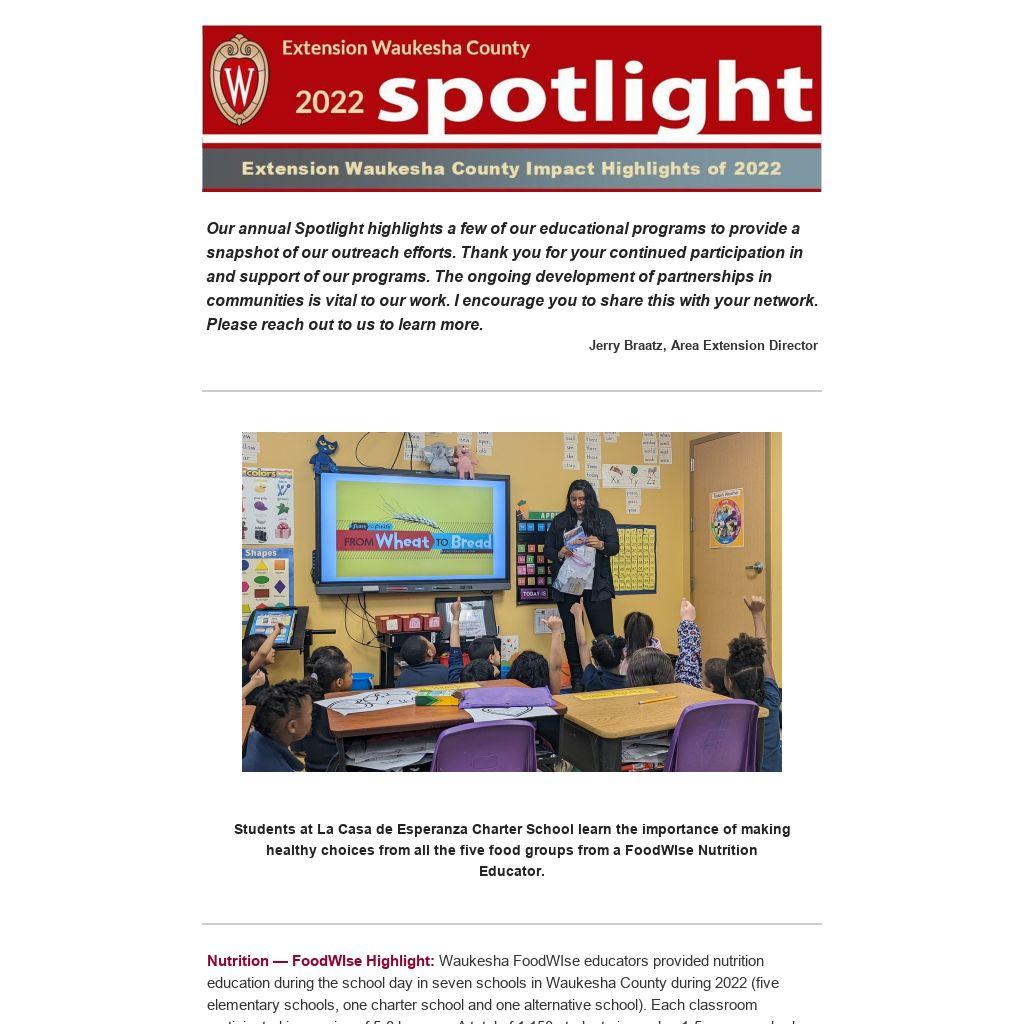 Our annual Spotlight highlights a few of our educational programs to provide a snapshot of our outreach efforts. Thank you for your continued participation in and support of our programs. The ongoing development of partnerships in communities is vital to our work. I encourage you to share this with your network. Please reach out to us to learn more.Jerry Braatz, Area Extension Director