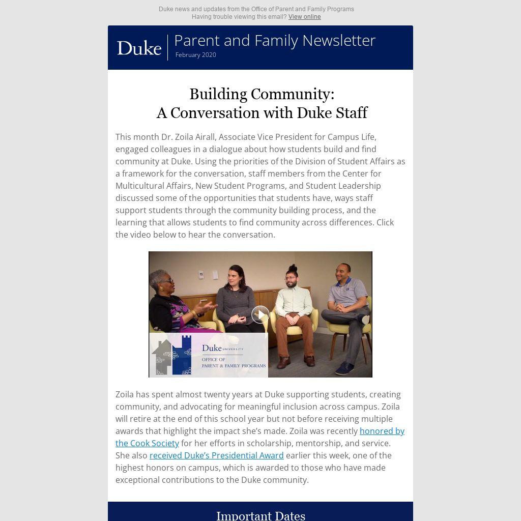 Save the date for Family Weekend 2020: Friday, October 16 - Sunday, October 18! Programming will include academic lectures as well as cultural and art highlights. Additionally, there is a collective effort by the University to ensure that Family Weekend provides the opportunity for family members to connect with other Duke parents and students.