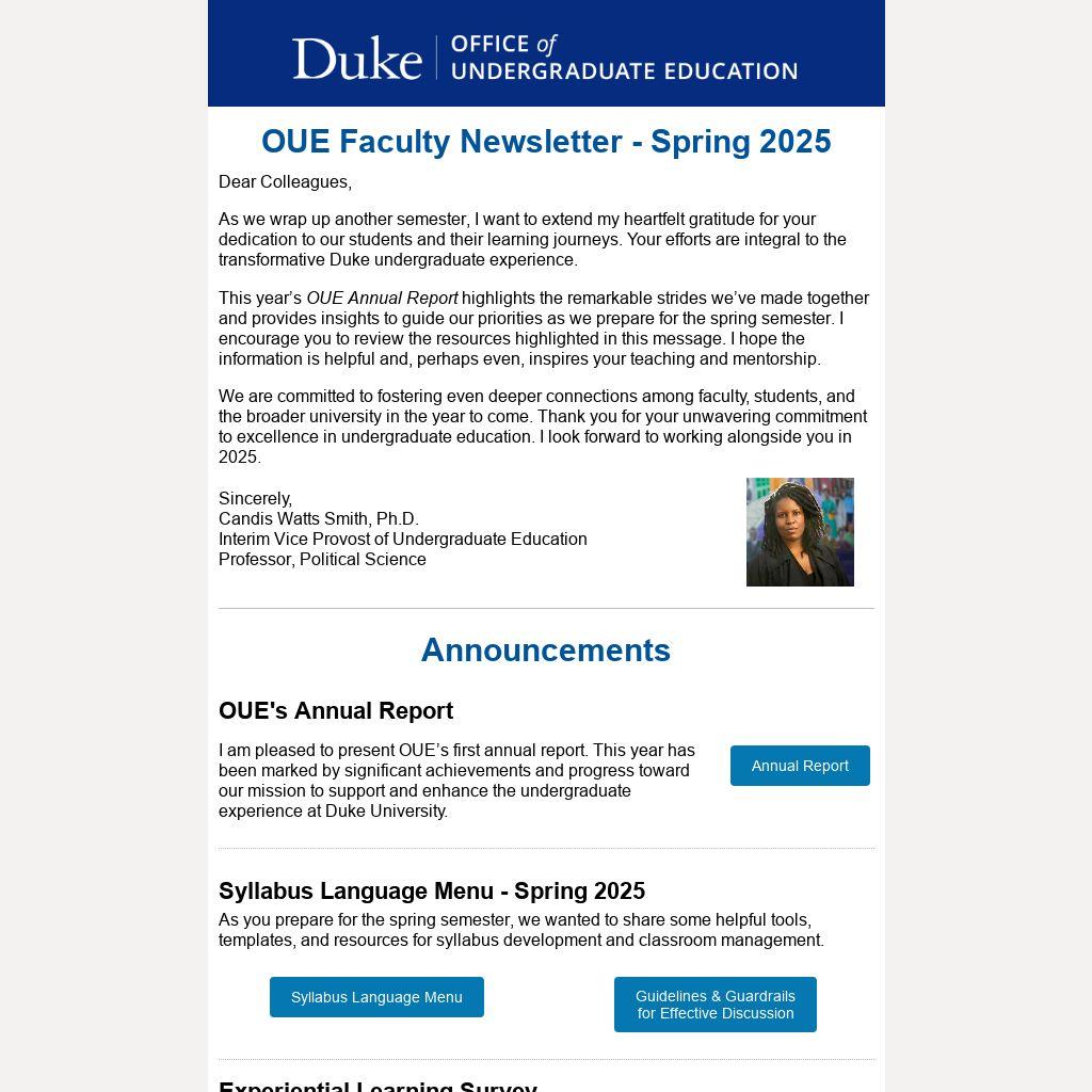 As we wrap up another semester, I want to extend my heartfelt gratitude for your dedication to our students and their learning journeys. Your efforts are integral to the transformative Duke undergraduate experience.