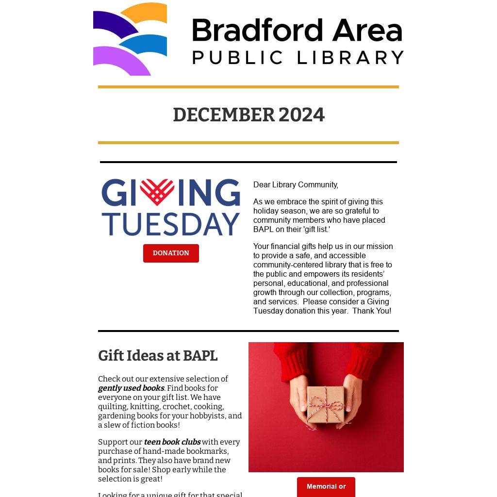 Your financial gifts help us in our mission to provide a safe, and accessible community-centered library that is free to the public and empowers its residents’ personal, educational, and professional growth through our collection, programs, and services. Please consider a Giving Tuesday donation this year. Thank You!