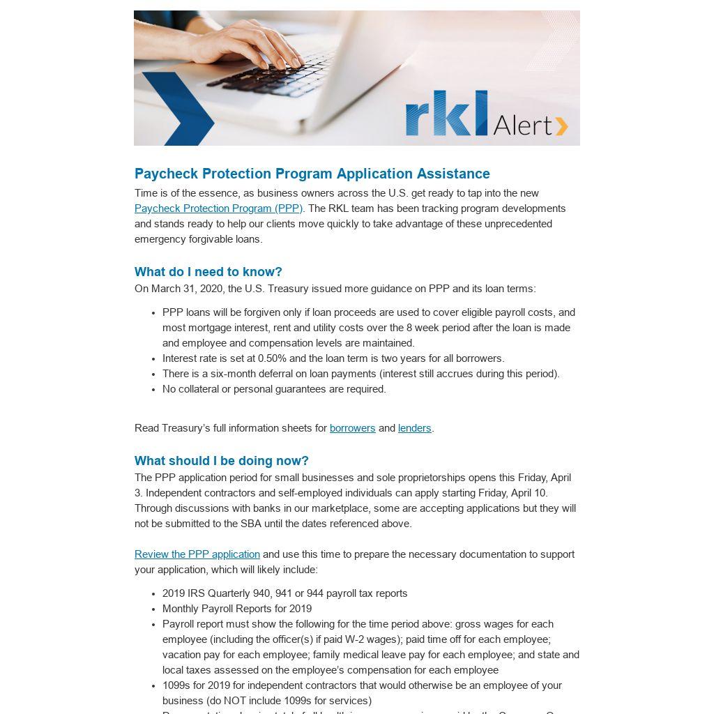 How can RKL help? Your RKL advisor can help you gather the necessary documentation, complete the application and answer any questions you have about PPP. Complete the Loan Assistance Request form on RKL’s Coronavirus Resource Center or contact your engagement partner to get started.