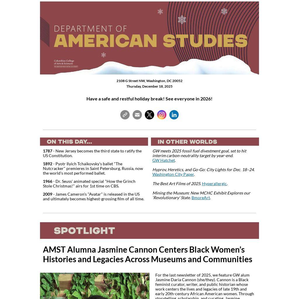 For the last newsletter of 2025, we feature GW alum Jasmine Daria Cannon (she/they). Cannon is a Black feminist curator, writer, and public historian whose work centers the lives and legacies of late 19th and early 20th-century African American women. Through storytelling, scholarship, and curating, Jasmine celebrates the vibrancy of historic Black communities and highlights their enduring cultural, political, and intellectual contributions to the nation’s history.