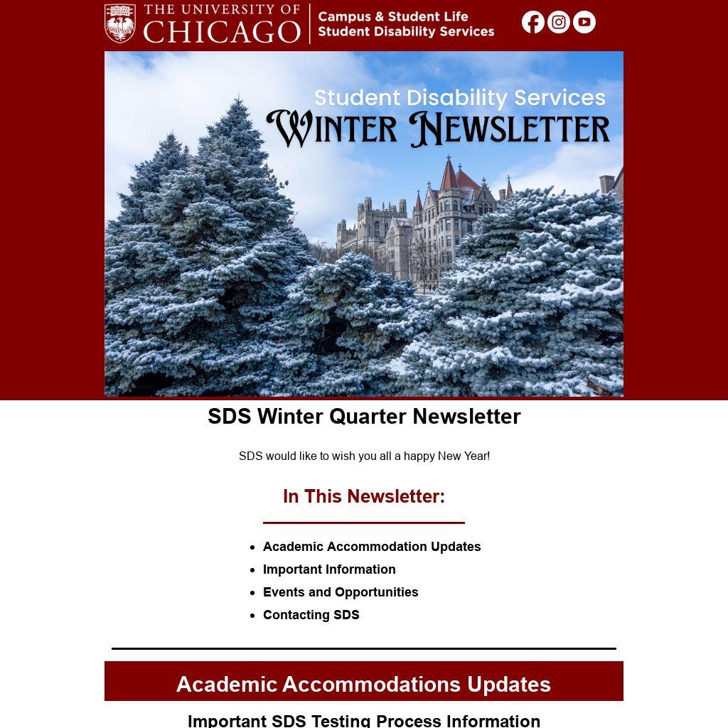The SDS office is available remotely via Zoom or telephone and in person by appointment only. For questions about accommodations or access matters, you may email questions to disabilities@uchicago.edu or call 773-702-6000.