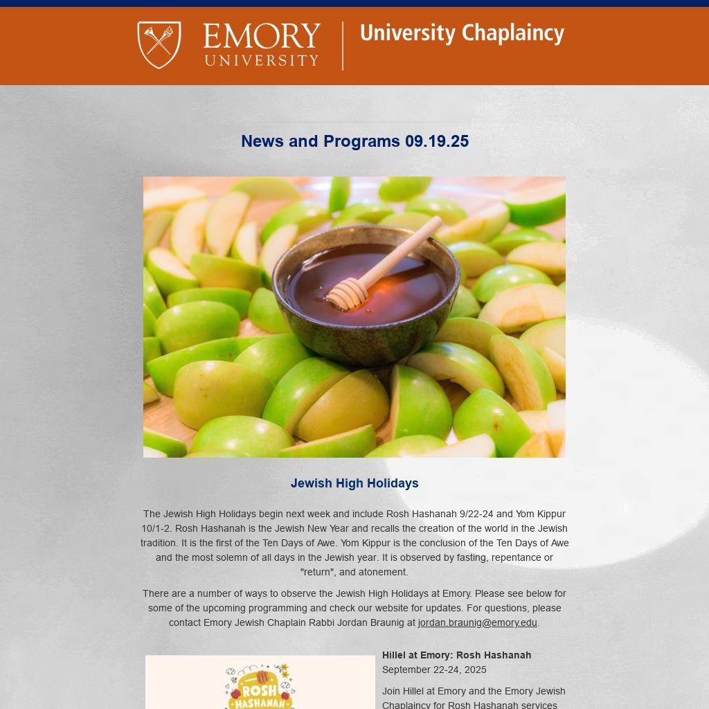 Emory University Chaplaincy ENews is published weekly during term by the Emory University Chaplaincy, publicizing Atlanta-campus spiritual life programs. It is not a comprehensive listing. For Oxford College spiritual life, please click here. To submit information or to update your preferences, please contact religiouslife@emory.edu.