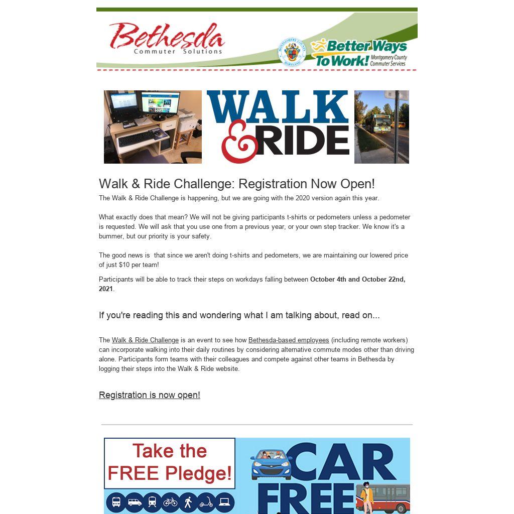 Bethesda-based employees (including remote workers) can incorporate walking into their daily routines by considering alternative commute modes other than driving alone. Participants form teams with their colleagues and compete against other teams in Bethesda by logging their steps into the Walk & Ride website.