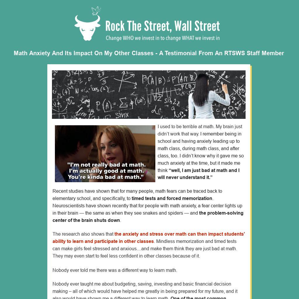 I may not have ended up in finance, but the work we do at Rock The Street, Wall Street still resonates with me. RTSWS familiarizes girls with math concepts without undue pressure and even provides female financial professionals who serve as live role models and show them what their future could look like.