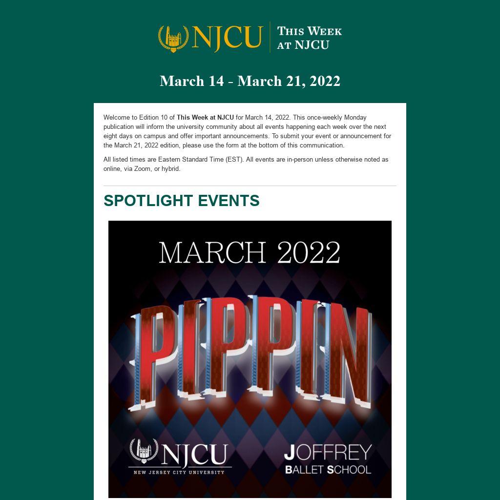 Welcome to Edition 10 of This Week at NJCU for March 14, 2022. This once-weekly Monday publication will inform the university community about all events happening each week over the next eight days on campus and offer important announcements. To submit your event or announcement for the March 21, 2022 edition, please use the form at the bottom of this communication.