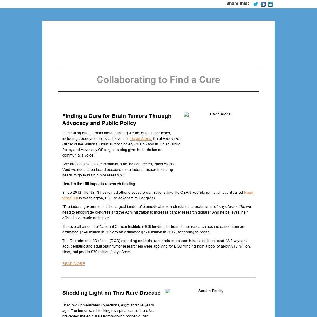 “We are too small of a community to not be connected,” says Arons. “And we need to be heard because more federal research funding needs to go to brain tumor research.”
