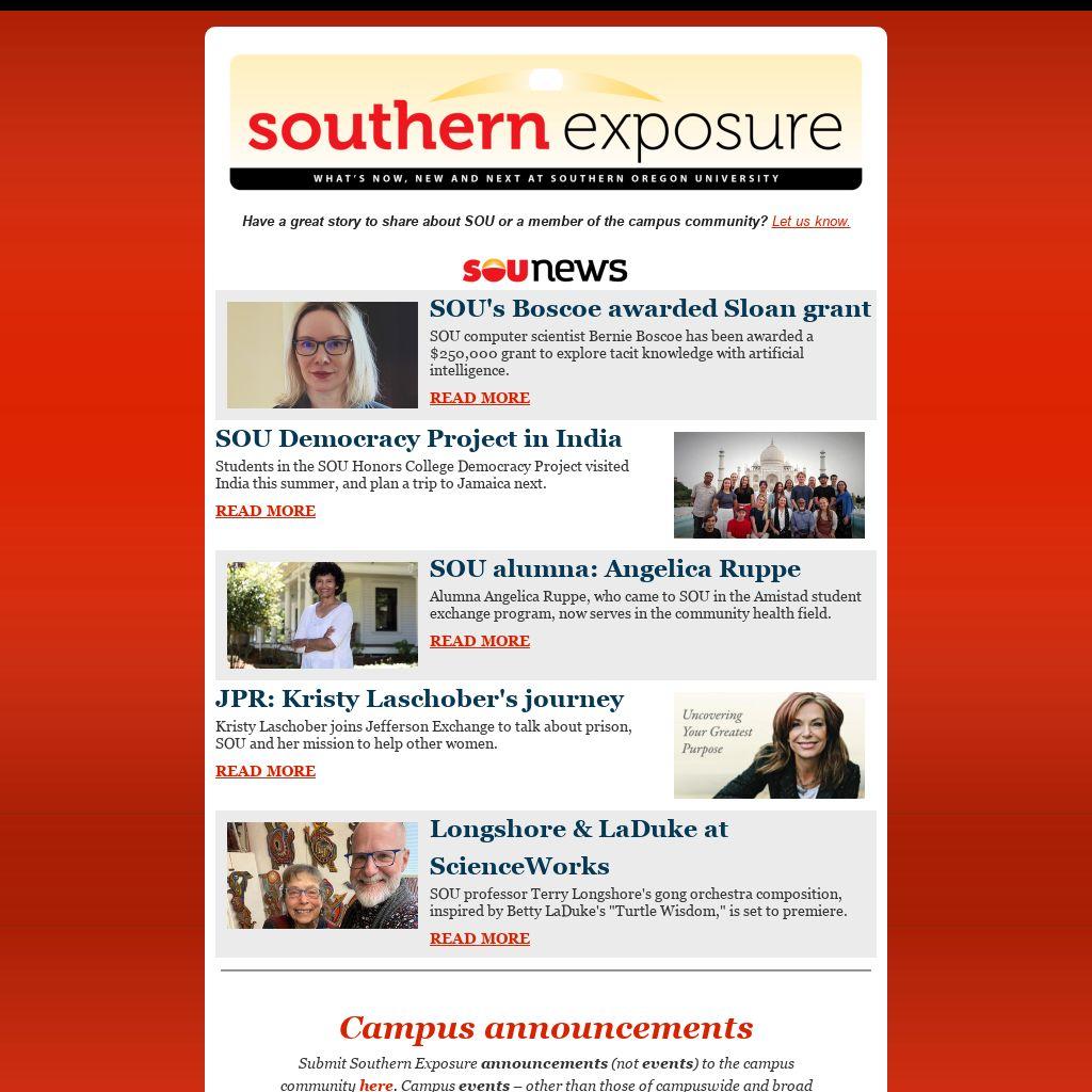 Submit Southern Exposure announcements (not events) to the campus community here. Campus events – other than those of campuswide and broad community interest – should instead be submitted to the SOU Events Calendar.