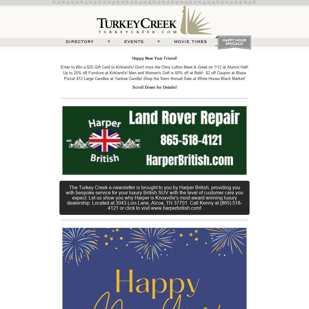 Enter to Win a $25 Gift Card to Kirkland's! Don't miss the Chris Lofton Meet & Greet on 1/12 at Alumni Hall! Up to 25% off Furniture at Kirkland's! Men and Women's Golf is 60% off at Belk! $2 off Coupon at Blaze Pizza! $12 Large Candles at Yankee Candle! Shop the Semi Annual Sale at White House Black Market!