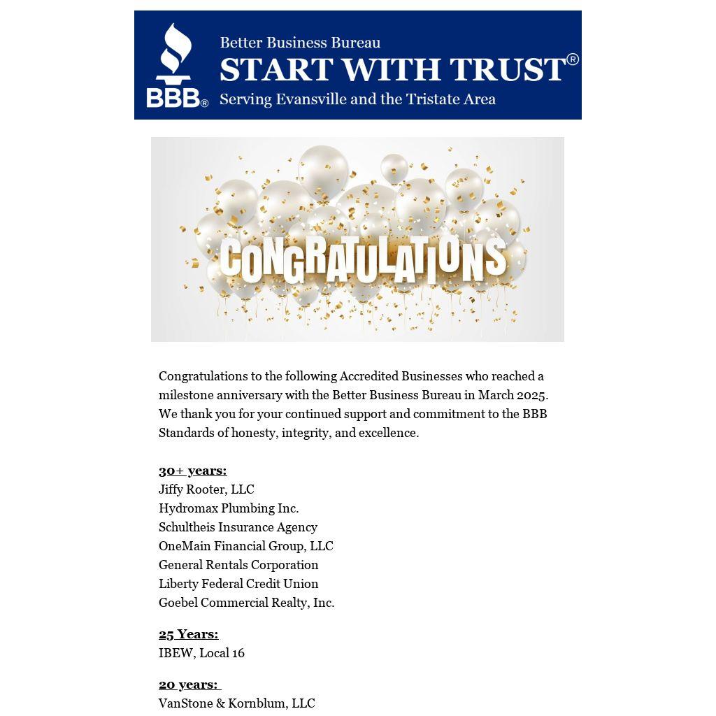 Congratulations to the following Accredited Businesses who reached a milestone anniversary with the Better Business Bureau in March 2025. We thank you for your continued support and commitment to the BBB Standards of honesty, integrity, and excellence.